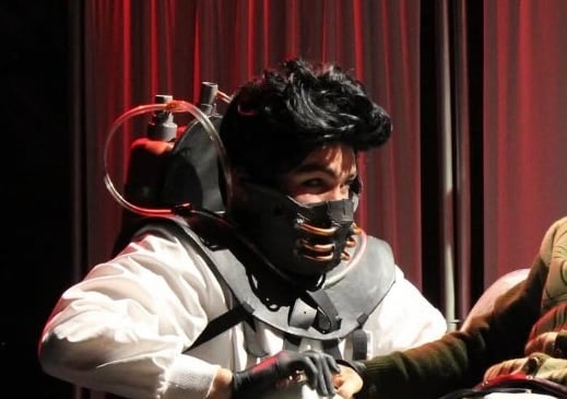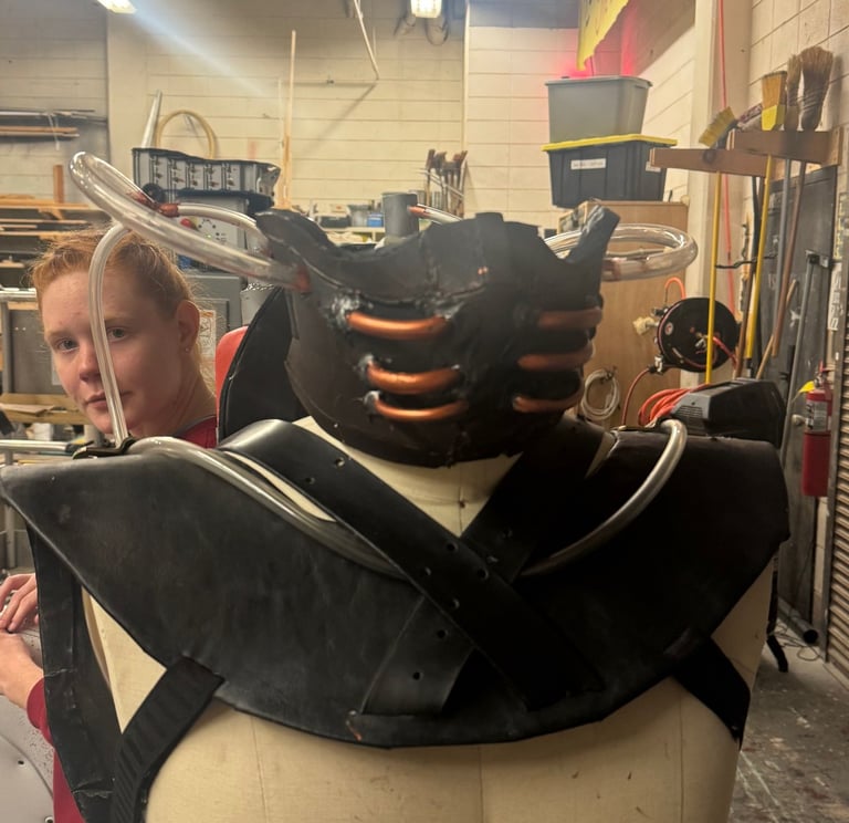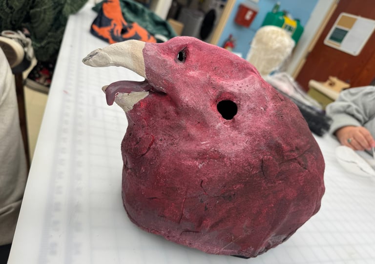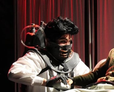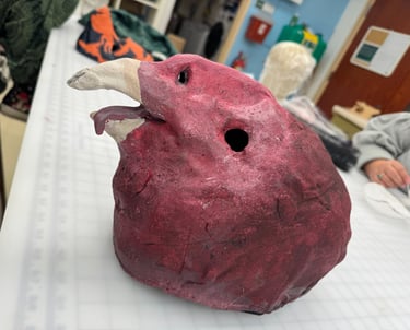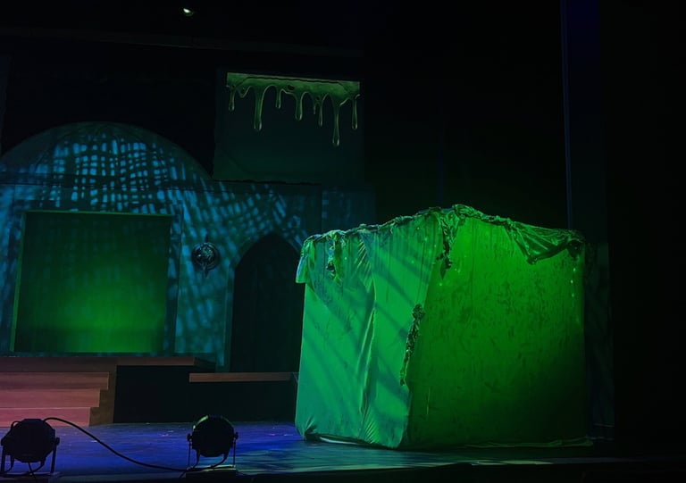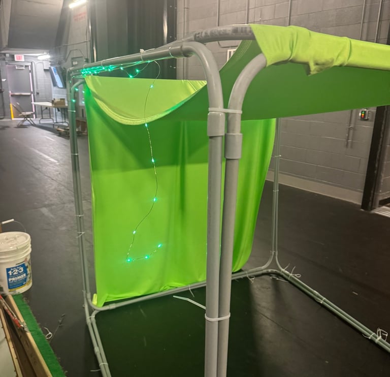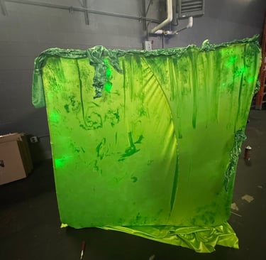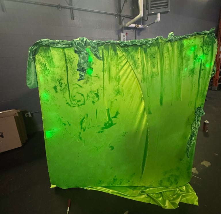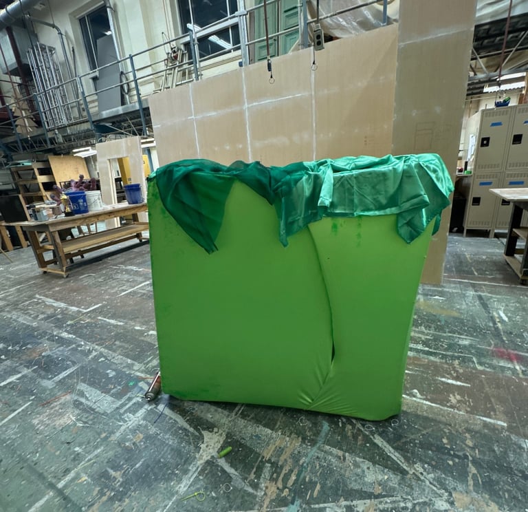 Built to 'swallow' our actors with one side, and be able to reveal with another. Needed a team of two to manuever onto the stage. Used PVC Pipe, and a spandex stretch fabric. There was a skirt that covered the actors feet when it was picked up