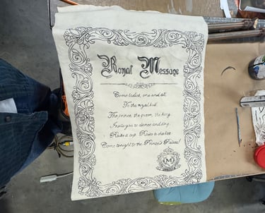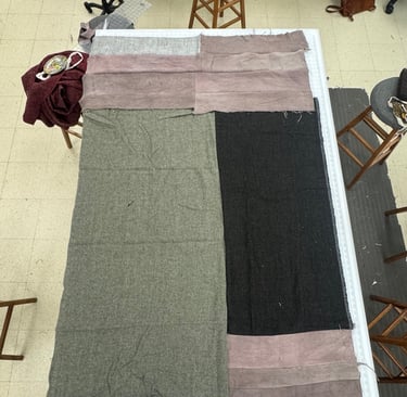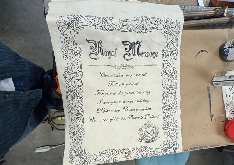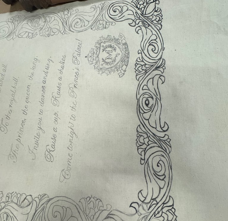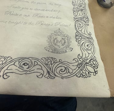 Used a thick piece of muslin, and used a projector to trace the image, and then paint with black paint.