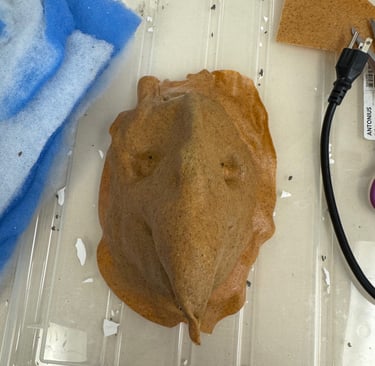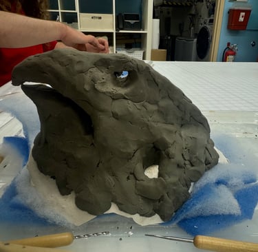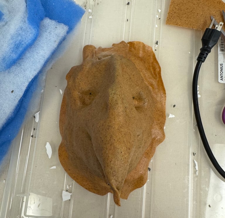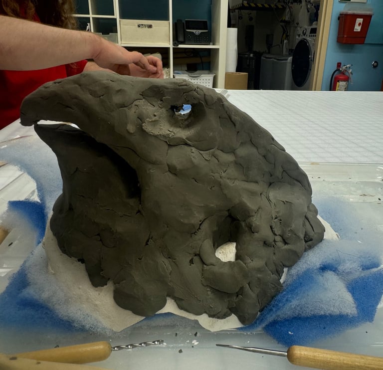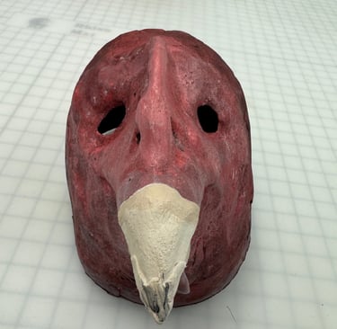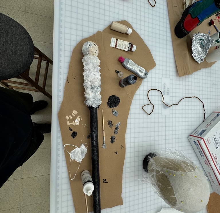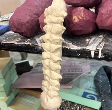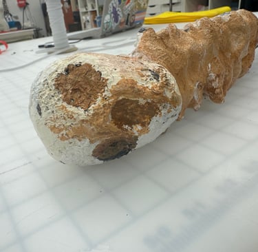 Built to look like a small spine, with a skull on top. Made out of air dry clay, and styrofoam.