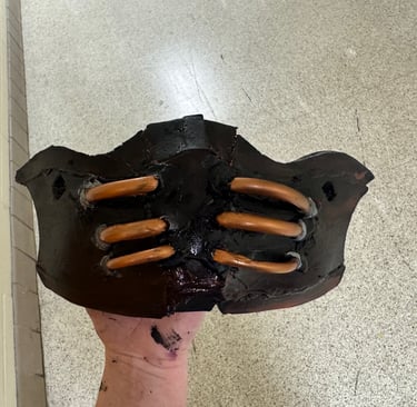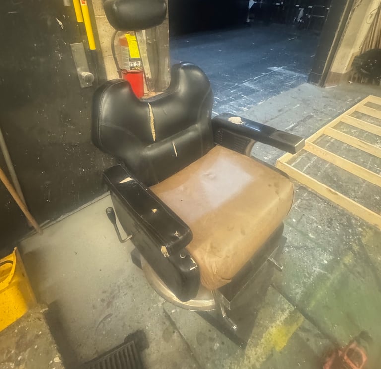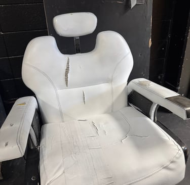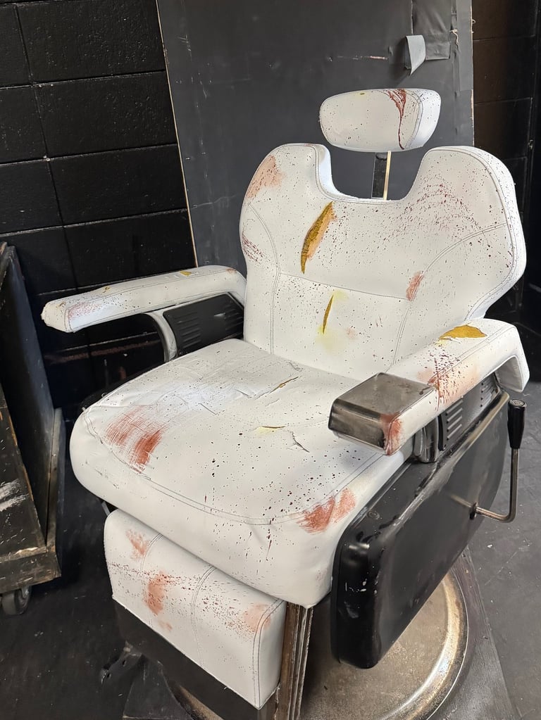 Used a viynl white spray paint to take the chair from black to white, and then used paint to age and make the chair feel 'nasty'. We then added velcro faux leather straps to buckle our actor in with.