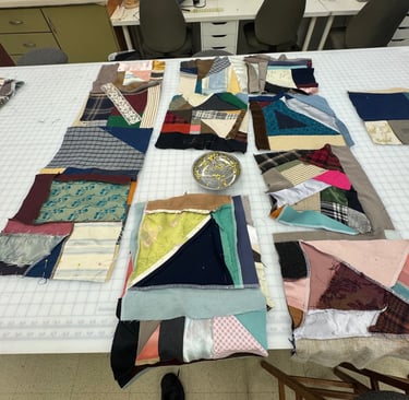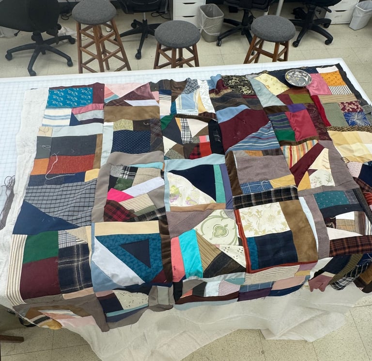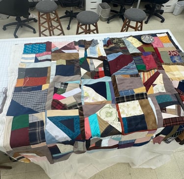 Inspired by both the traditional 'Crazy Quilt' fad of the 1880s, and the prospect of Esther using her quilt as a fabric scrapbook.